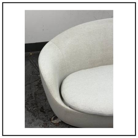 Design Plus Gallery presents the Lna Sofa by Hlynur Atlason for Design Within Reach. The sofa is named after the Icelandic word for line, the Lna Sofa has curved lines and a subtle oval footprint, giving the piece a spirit of movement and fluidity. It has an off white neutral tone, loose bottom seat cushion, and curves to die for. Get it while you can as this style is no longer in production with the brand. The sofa does shows show signs of wear that are consistent with usage but overall in good condition.