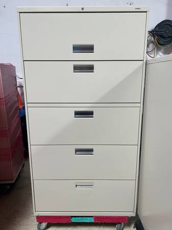 (1) Used Hon 695L 42W x 19.25D x 66.5H 5 drawer lateral file with posting shelf & chome pulls in putty $450