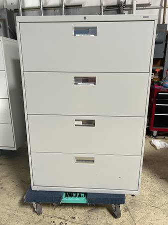 (4) Hon 684L 36"W x 19.25"D x 53.25"H 4 drawer lateral file with recessed chrome pulls in putty $375