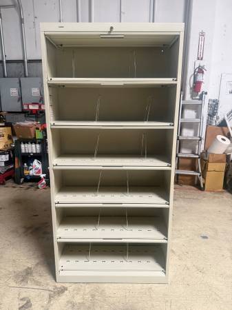 (7) Used Hon 626L (626LL / 626L-L) 36W x 13.75D x 75.5H 6 door letter size shelf file with flipper receding doors, wire racks & lock & key in putty with chrome pulls. (For manila folder, medical / insurance files or other high capacity filing) $395