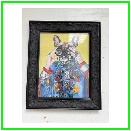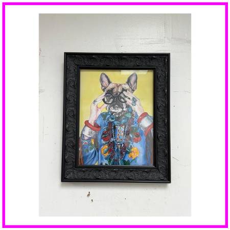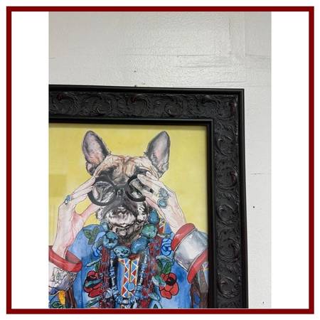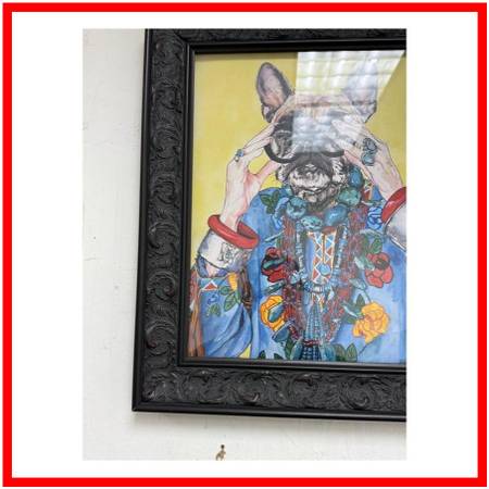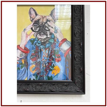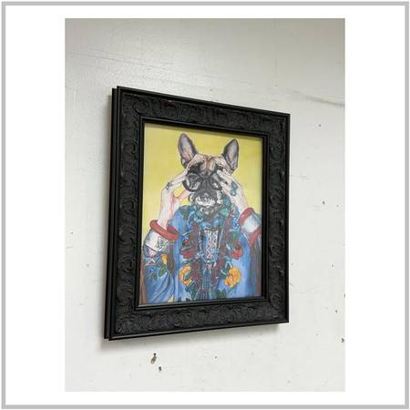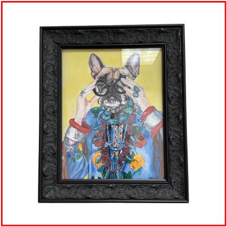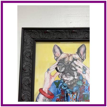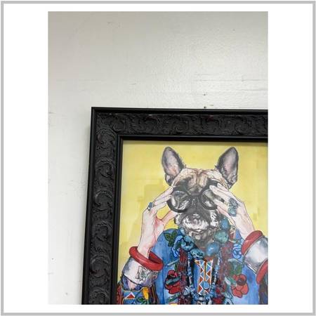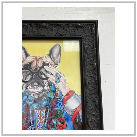 Design Plus Gallery presents Iris Apfel as a Bulldog, a Pop Art Giclee Print by Ivy McConnell. What a fun portrait of a true fashionista that never aged out of the fashion world and only got stronger and more in demand as her years carried on. The use as a frenchie bullie is such a great replacement with the wrinkled but remarkably youthful face that always seem to have. It is framed in a thick + carved black frame. It is in good condition for its usage.