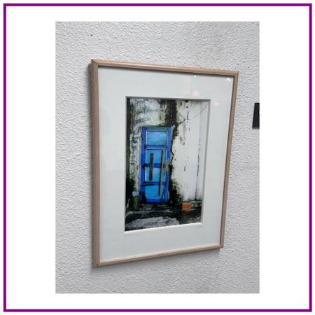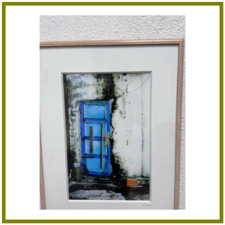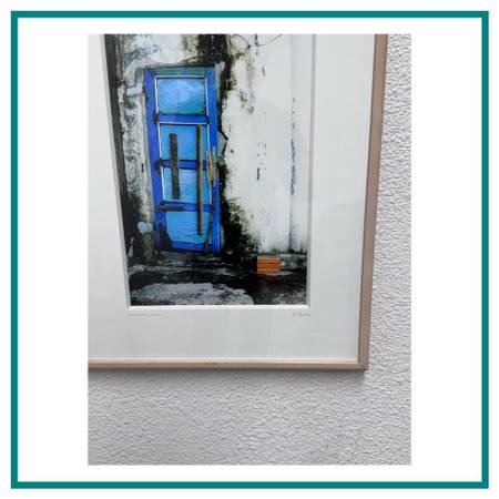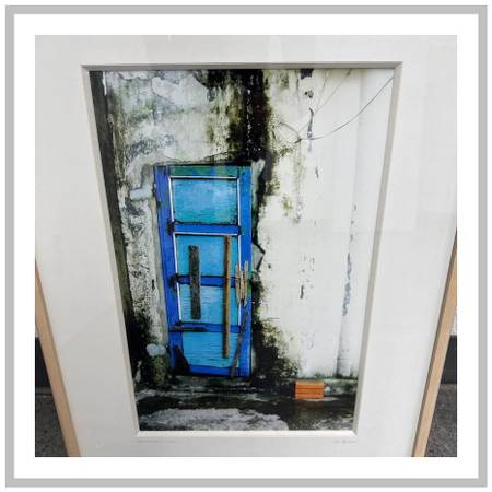 Design Plus Gallery presents Blue Door, Hoi An Vietnam by Jerry Szymczak. This color photograph is an original by the artist with his signature + title at the base of the art piece. It has a vibrant blue door that was captured on his travels to the Asian country. The piece brings a bright focal point of vibrancy to an otherwise desolate and gritty background. The piece is framed and in good condition.