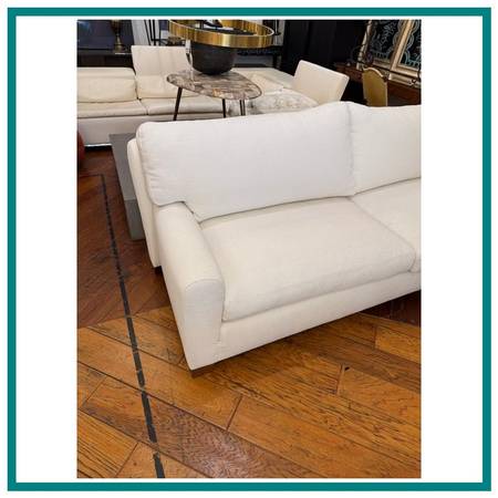Design Plus Gallery present a Custom Transitional Sofa from Donghia. Designed by John Hutton. (19472006). A truly exquisite piece which effortlessly merges style and comfort. A key characteristic of this charming design is the curved arched arms and back. The foundation of the sofa is a plinth wood base, finished in a rich, dark chestnut. The sofa has been meticulously reupholstered in a clean, white highperformance fabric. This not only enhances the sofas durability but also its versatility, allowing it to seamlessly blend with any color scheme or home decor style. The sofa includes two seat back cushions nestled under another two back cushions, all covered in the same premium white fabric. These cushions are not just aesthetically pleasing, but also designed with comfort in mind. Each back cushion contains foam inserts, ensuring excellent support and cushioning. The seat cushions also utilize foam inserts but with an additional feather wrap. This thoughtful design element provides a plush seating experience that molds to the body, adding a further layer of luxurious comfort. The elegant design, highquality material, and clever use of cushioning. No brand labels. In good condition, minimal wear. Made in USA.