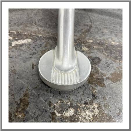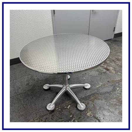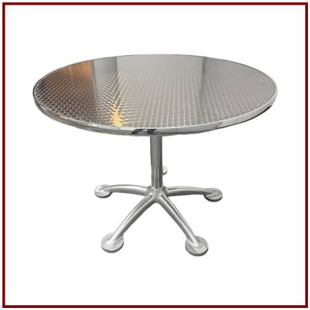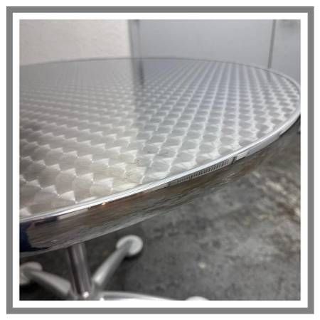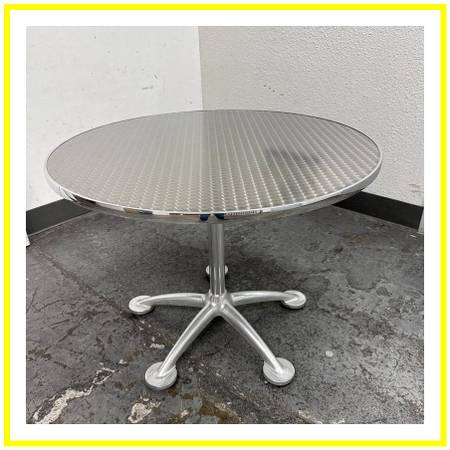 Design Plus Gallery presents a Modern Aluminum Table by Jorge Pensi for Knoll. Designed in 1988 and produced by Amat3 for Knoll, this caf table was intended as a companion to his outdoor Toledo chair. The base is made of anodized and polished cast aluminium standing on splayed feet. The classic stainless steel top features a machined pattern of mesmerizing concentric circles. Light defects in the machine pattern on top; condition is good for age and use.