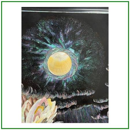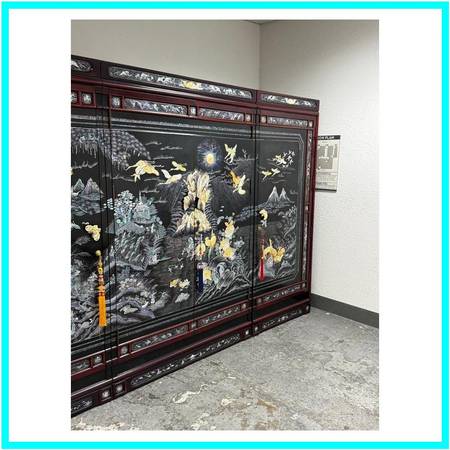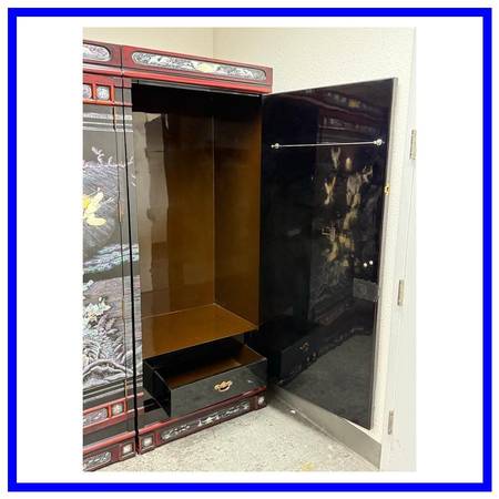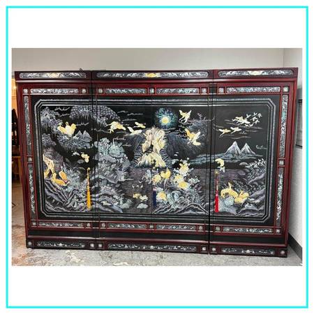Design Plus Gallery presents a Complete Wardrobing Armoire of Korean Character with MotherOfPearl Inlaid, Artfully + Scenically Placed. It is wall sized + comes in three light weight sections. The process in which this wardrobe was created involves layering of lacquer, inlaying the motherofpearl, and then polishing the entirety of its surface. The inlays shows a nature scene with birds, trees, the moon, mountains, and waves front and center. Around the finished front + sides is bordered detail work as well. The inside of the armoire is finished + also acquired with a golden tone. You will find the side cabinets offering hanging rods with one on the door + drawers. The middle section has shelving. the armoire is a work of art, with functioning keys to lock your valuables. Is in good condition with minimal wear.