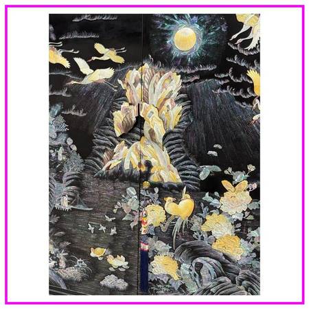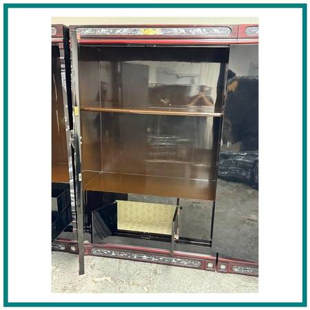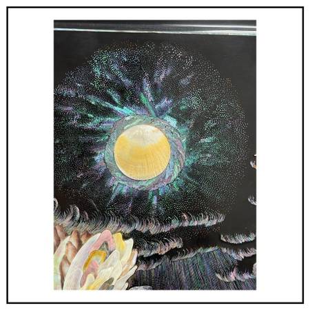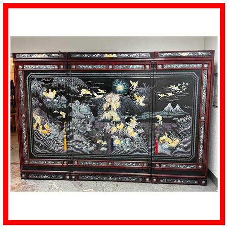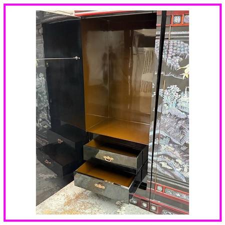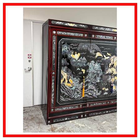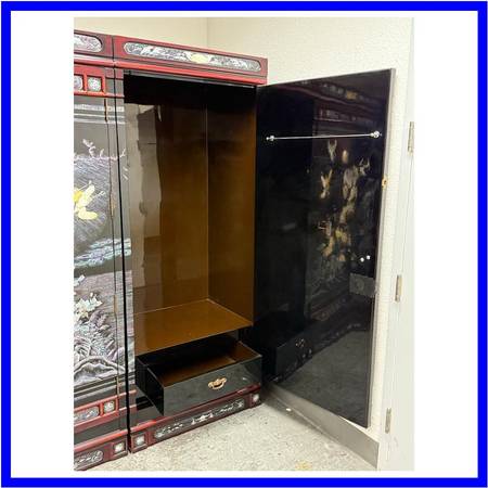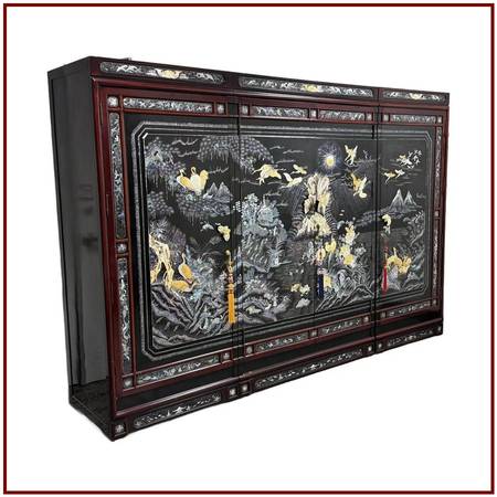 Design Plus Gallery presents a Complete Wardrobing Armoire of Korean Character with MotherOfPearl Inlaid, Artfully + Scenically Placed. It is wall sized + comes in three light weight sections. The process in which this wardrobe was created involves layering of lacquer, inlaying the motherofpearl, and then polishing the entirety of its surface. The inlays shows a nature scene with birds, trees, the moon, mountains, and waves front and center. Around the finished front + sides is bordered detail work as well. The inside of the armoire is finished + also acquired with a golden tone. You will find the side cabinets offering hanging rods with one on the door + drawers. The middle section has shelving. the armoire is a work of art, with functioning keys to lock your valuables. Is in good condition with minimal wear.