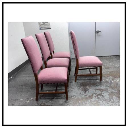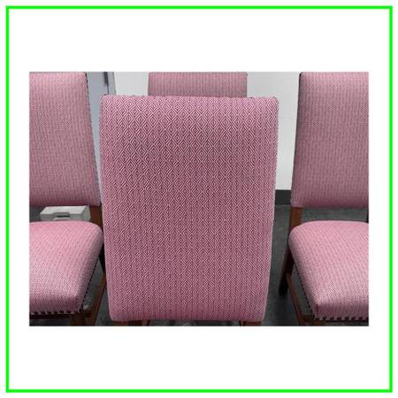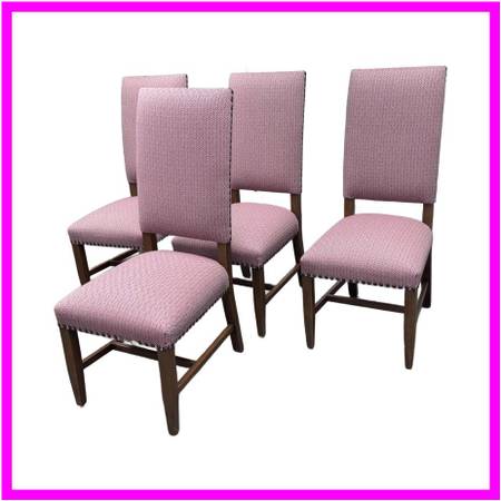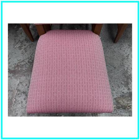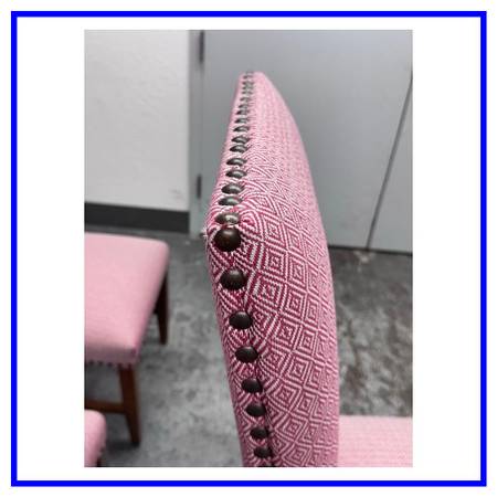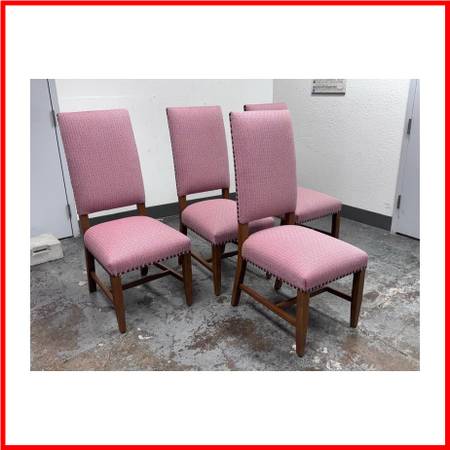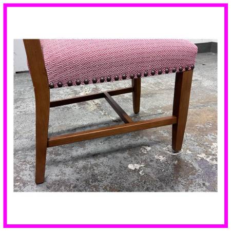 Loggia Showroom Custom Design Red Diamond Patterned + Nailhead Dining Chairs, Set of Four. Original Price: $3,200