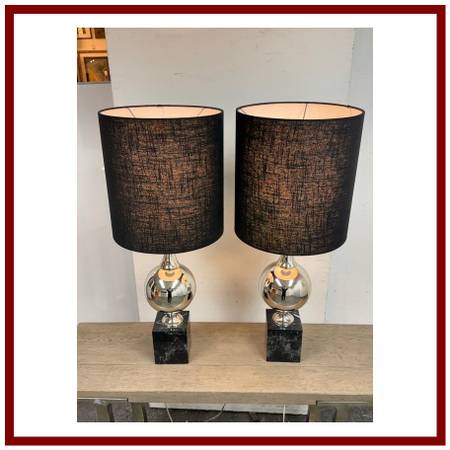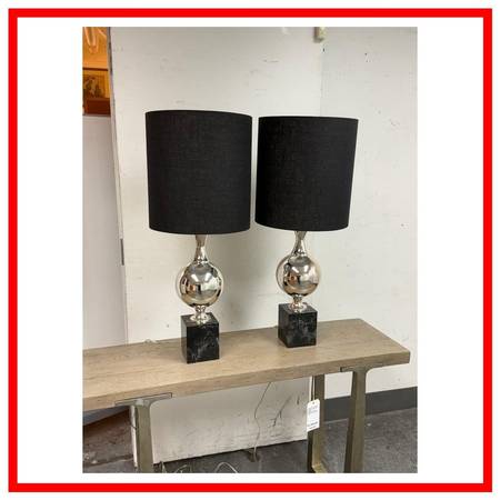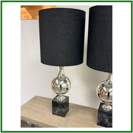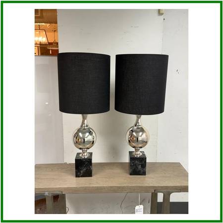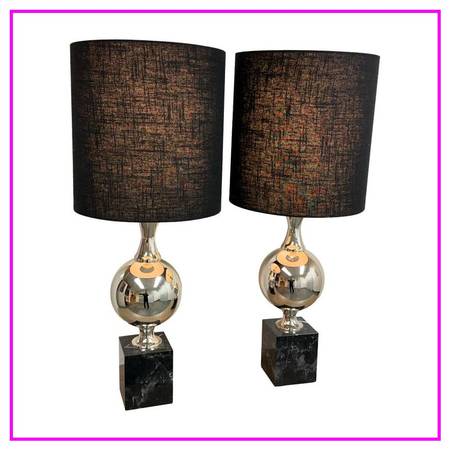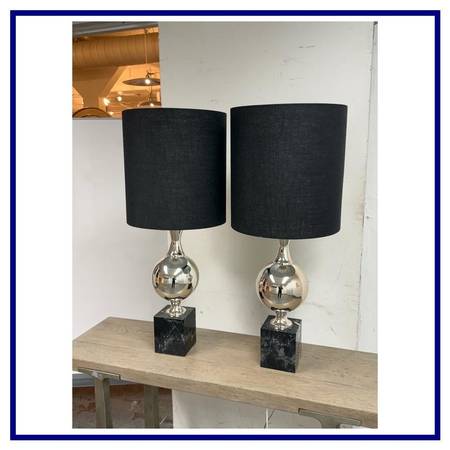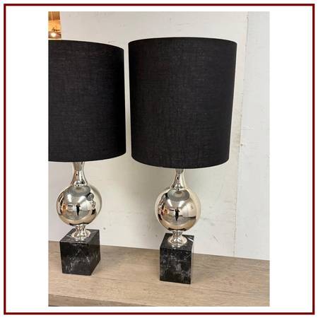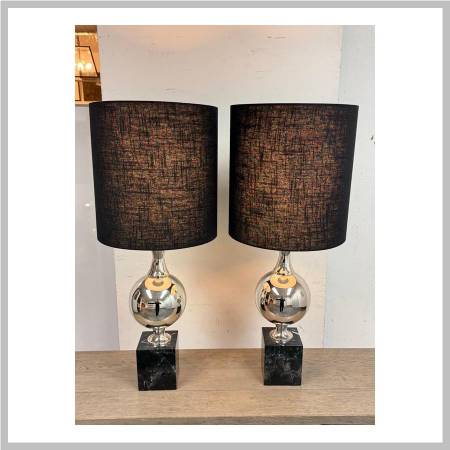 Design Plus Gallery presents a Pair of Maison Barbier Style Table Lamps. Attributed to Philippe Barbier (Paris, 1960s). Elegantly sculptural and distinctly midcentury modern, these lamps combine polished chromefinish steel with weighty black marble plinth bases, creating a refined interplay of gloss and depth. The architectural silhouettes read as functional sculpture, their clean geometry and luxe materials typical of Barbiers Parisian atelier. Each lamp is topped with a tall black linen drum shade that elongates the profile and tempers the chromes sheen, delivering a sophisticated presence on a console, credenza, or bedside. There is no brand logo. In good condition, visible and minimal wear.