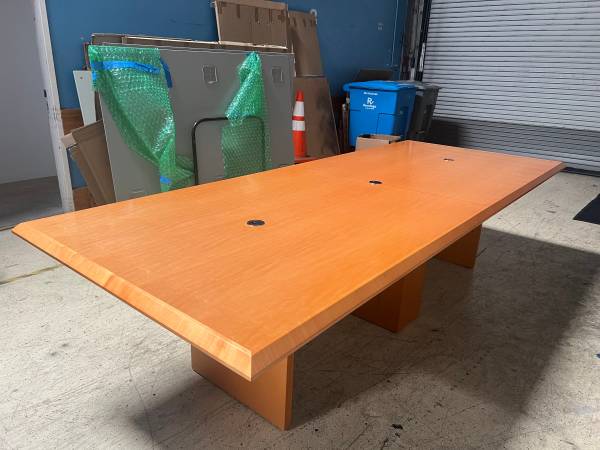 (1) Used 10 Ft x 4 Ft rectangular table (2 piece top) with (2) 2.5" plastic black grommet covers, (2) panel bases & (1) rectangular bases with access door in warm maple wood veneer with reversed beveled wood edge $1,150