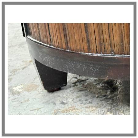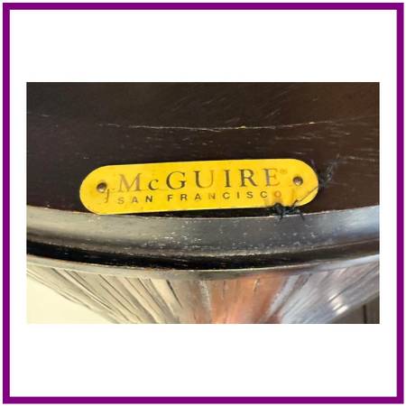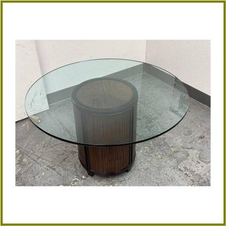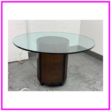 Design Plus Gallery presents Vintage Bamboo Pedestal Dining Table with Thick Pane Round Glass Surface from McGuire. The table was sourced in the Early 21st Century from Robert Noble Interior Design House. The base is a drum shape and wrapped in dark finish sustainable bamboo. It is separated into quarters with dark metal segments. There is wear that is consistent with its vintage age but overall is in good condition.