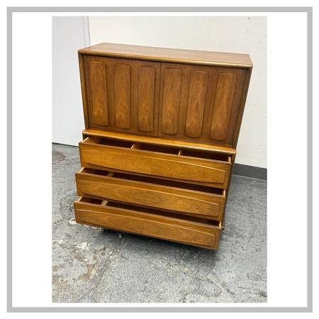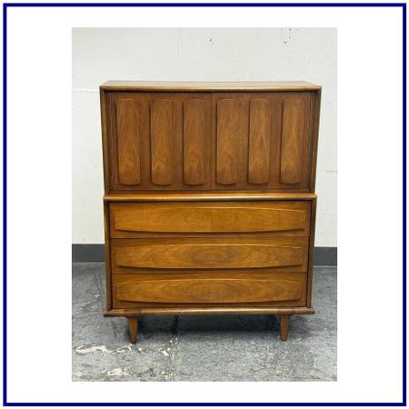 Design Plus Gallery presents the Gentlemans Dresser from the Mid 20th Century from American of Martinsville. The Gentlemans cabinet is in a nice honey brown tone that was prevalent and very much of that era and style greatly appreciated and in demand. It is a single piece with the upper portion having a design of six vertical wood panels with rounded edges that open like cabinet doors to reveal two interior drawers. The lower section has three drawers of the same size and it rests on tapered legs. Two of the back legs have been through repair for it had been broken, new screws were added. Other than that the chest of drawers is in good condition for its vintage usage. Made in the USA.