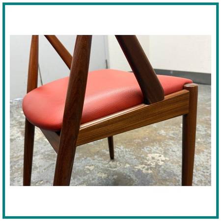 Design Plus Gallery presents a Set of Eight Mid Century Mobler Dining Chairs from Kai Kristiansen. This set showcases sculpted bentwood frames with gently angled legs and curved backrests that offer supportive seating without visual heaviness. They are upholstered in their Torino Rust Garrett leather that adds a bold pop of color that matches just about anything. Their form makes them ideal for use as a full set, while the compact profile allows them to fit comfortably around a variety of table sizes. In good condition, visible and minimal wear from usage. Made In Denmark.