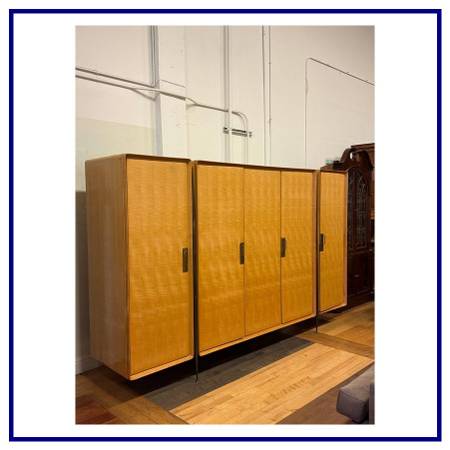 Design Plus Gallery presents an Italian Wardrobe from the Mid 20th Century Attributed to Italian Designer Silvio Cavatorta. This piece, with its harmonious balance, represents a perfect example of functional furniture characterized by clean, sculptural lines. The three piece armoire consists of interconnected vertical sections resting on slender gold toned metal legs with brass tips. Made of Italian Birch wood, it features golden brown grain and smooth surfaces. The clean, essential lines combined with rounded forms perfectly reflect the modernist movement of the mid20th century. The doors, finished smoothly with barely visible vertical grooves, are equipped with flush brass handles that add a touch of elegance and functionality. Two of the doors offer full length mirrors when opened. The left section offers shelving and five drawers while the remaining compartments offer hang storage. It shows visible wear that we consider to be consistent with its vintage age but overall in good condition. Does not come with key.