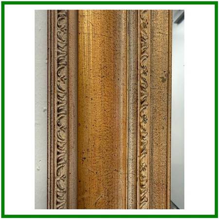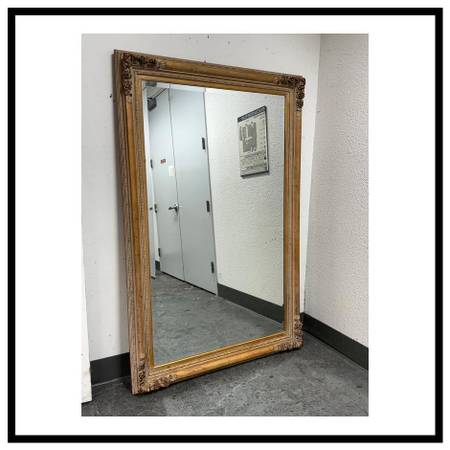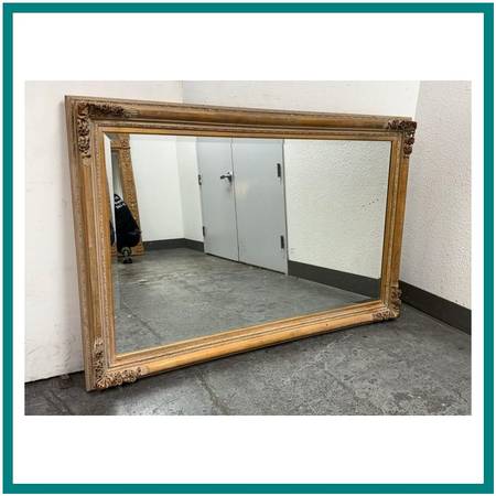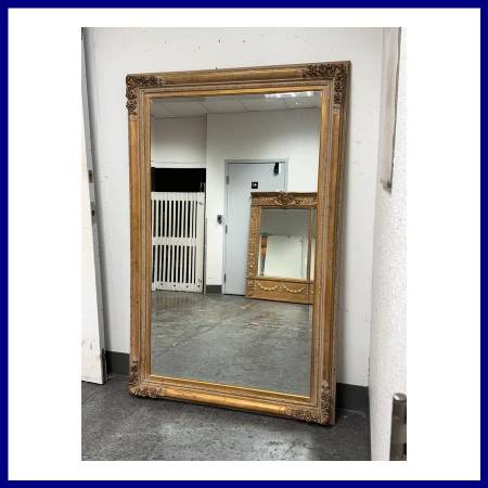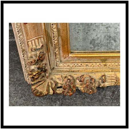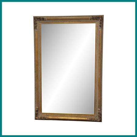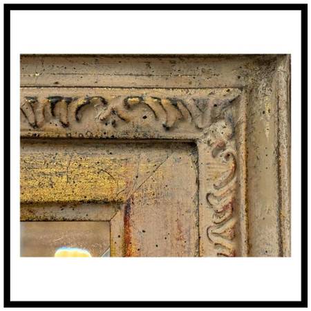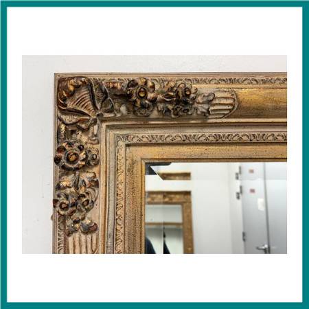 Design Plus Gallery presents a Gilt Wall Mirror with Neoclassical Style. This mirror has a carved + detailed frame that encases a beveled edge mirror. The frame has rosettes on each of the four corners and an antique finish that is distressed with purpose. There are hanging connections on the back allowing for this to be hung length or long ways. It is in good condition for its usage.