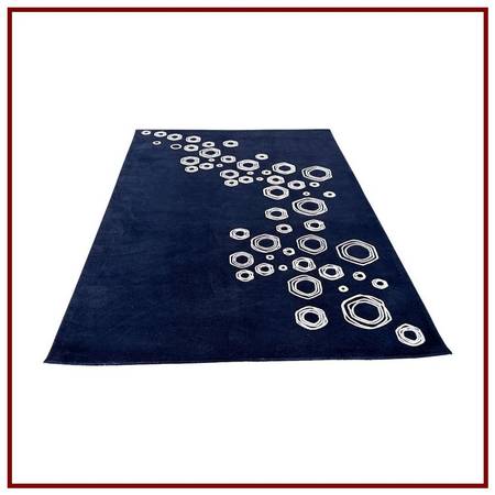 Design Plus Gallery presents a 6ft6in 9ft10in Cirkel Area Rug from Cappellini. Designed by Ilaria Marelli. This rug boasts a captivating geometric pattern of white circles and hexagons set against a midnight black background. Handtufted from highquality New Zealand wool and natural fibers, the rug provides not only a visually appealing accent but also a plush, comfortable surface underfoot. The generous dimensions make it a versatile addition, ideal for anchoring living rooms, dining areas, or spacious bedrooms. Its monochrome color scheme allows it to blend seamlessly with a wide range of interior styles. Was a Showroom Sample, In good condition, visible and minimal wear. Made in Thailand.