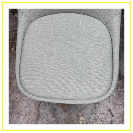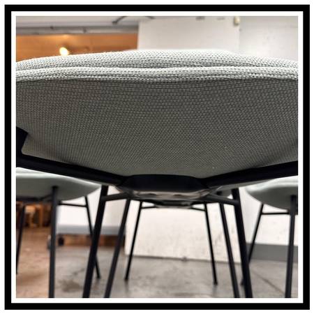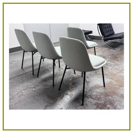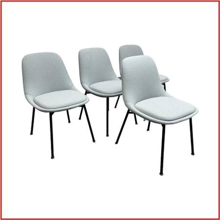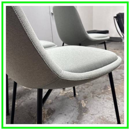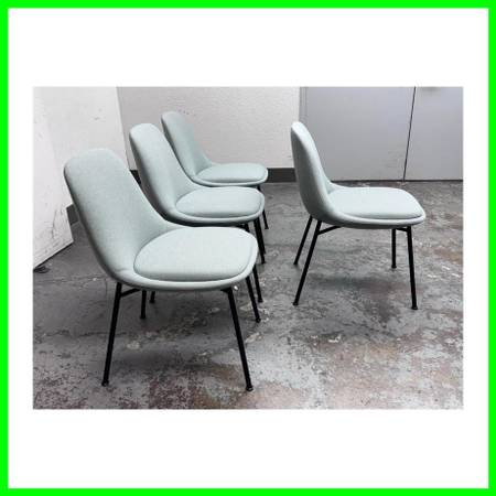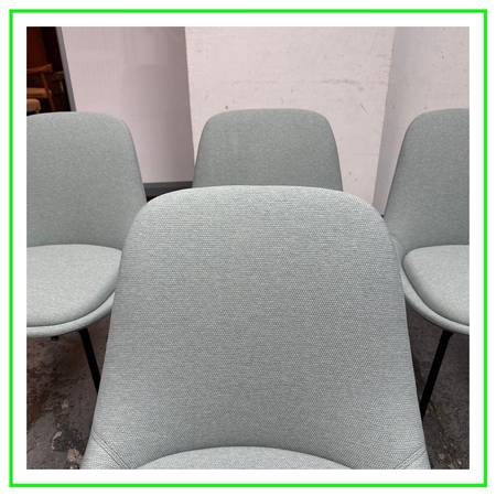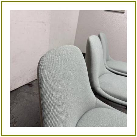 Design Plus Gallery presents a Set of Four Sky Upholstered Chloe Dining Side Chairs from Bernhardt. The Chloe seating collection was created to add gracefully rounded forms to collaborative workspaces and dining rooms. Its seat offers a substantial cushion while maintaining a streamlined look. Chloe also provides remarkable back support as one is enveloped in the curved shell. Successfully merging function and style. They are in showroom like condition with minimal signs of wear for their age. Made in the USA.