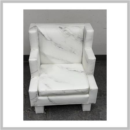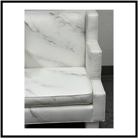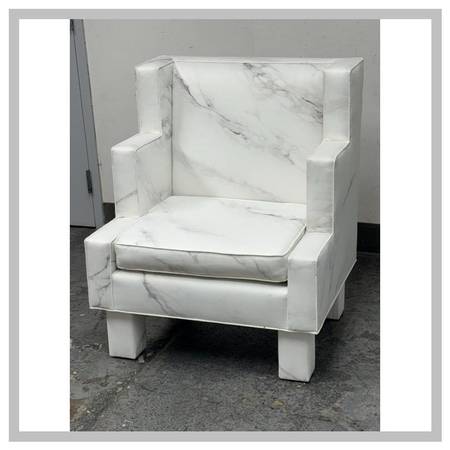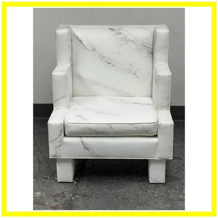 Design Plus Gallery presents a Custom Design Steeped Arm Lounge Chair by D W M Maloos. the upholstery is so exquisite, rare and complimentary to luxe living as it has a finish to resemble Carrera marble. This is a showroom piece and is in good like new condition with minimal signs of usage. From the San Francisco Design Center.