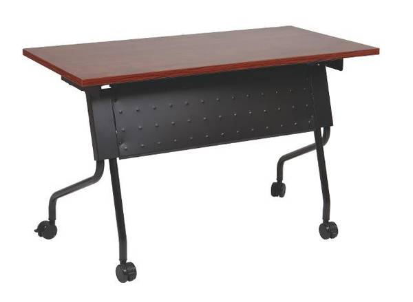 These new flip top training tables allow quick set up, change & easy transportation & relocation. Easily convert from training to classroom to conference room configurations throughout the day. Flip mechanism can be activated from either end. Top locks into position whether upright or horizontal. Frame features modesty panel & 4 locking casters. Tops are 1" thick laminate with 3mm PVC. These flip top tables are also very versatile to convert the tables into a large rectangular as well as large U shaped conference table with a new easy to reach , easy to secure ganging feature with metal to metal connection underneath the table tops.