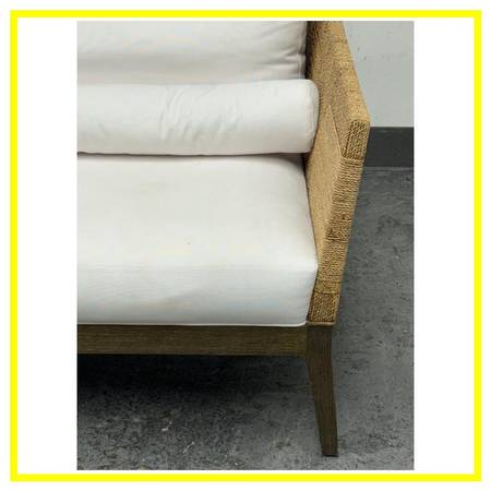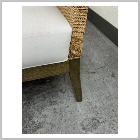 Design Plus Gallery presents a Cameron Lounge Chair and Half from Palecek. Combines striking craftsmanship with inviting comfort, making it a luxurious statement piece for any living space. The base frame features an understated yet elegant dark espresso finish, enhancing its rich, contemporary appeal. Showcasing Paleceks mastery of natural textures, the chairs doublewall back and sides are handwoven from natural seagrass rope, resulting in an eyecatching pattern that adds dimension and visual interest from every angle. A fixed seat cushion for stability and support, while a loose back cushion and a coordinating bolster pillow invite you to relax in style. The blend of natural materials with tailored upholstery creates a harmonious balance of organic warmth and sophisticated design. In good condition, visible and minimal wear on frame and upholstery. This is a discontinued model from the brand.
