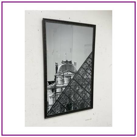 Design Plus Gallery presents a Framed Print of the Lourve + its Pyramid by Philippe Hugonnard The iconic backdrop is a close up showcasing the two structures and how different their perspective is. Philippe Hugonnard is a French photographer, born in Geneva, Switzerland. He creates unique photos and works of art by mixing multiple types of digital media. His photos establish a link between urban reality and that imagined by him. The print is encased in a thin black frame and is in good condition for its usage.