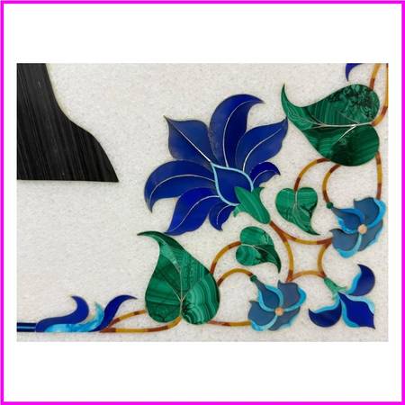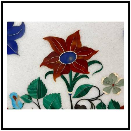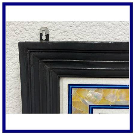 Design Plus Gallery presents the Tree of Life Panel of Marble Inlays in Pietra Dura style. The panel is bolden with colors and the tree is bursting with limbs holding colorful flowers. Each corner of the frame also offers a symmetrical design of blue flowers with green vines. There is a cream border and then the remainder of the piece is framed in a black wood frame. Visible wear is presents and is consistent with its age + use. Made in India.