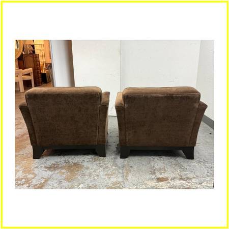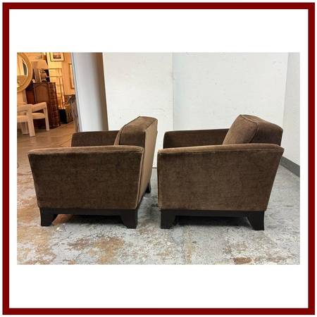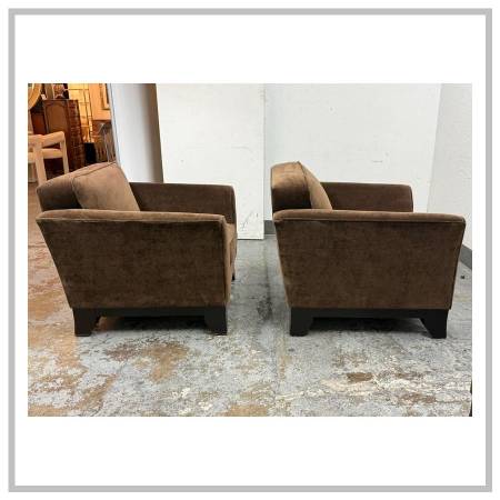 Design Plus Gallery presents a Pair of Brown Velvet Accent Chairs + Matching Ottoman from Pottery Barn. The chairs have a flared arm to invite a wider seat with favorable contemporary style. Their sultry velvet fabric is even richer with the tone of dark chocolate brown, can please a wide variety of homes. Conditions are minimal with surface wear mainly on the ottoman with visible scratches on base and feet.