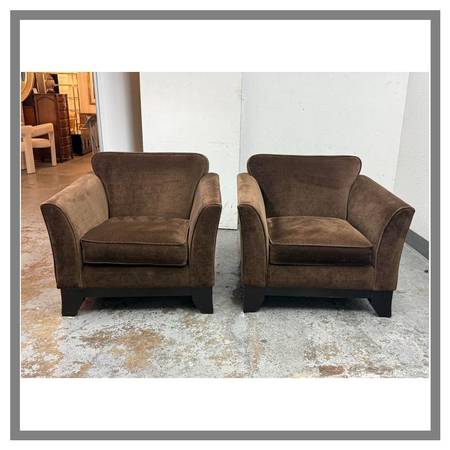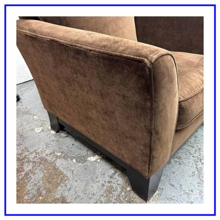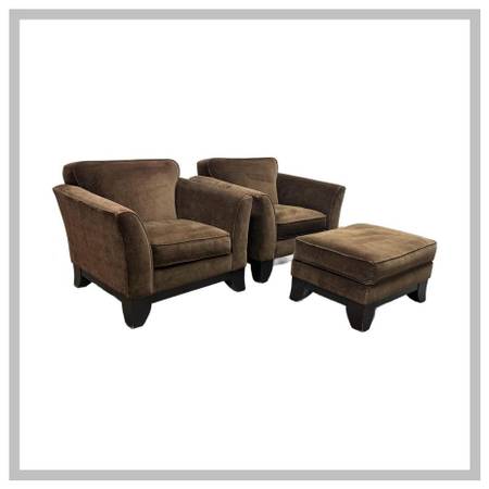 Pottery Barn Dark Brown Velvet Chairs + Ottoman, Set of Three. Original Price: $2,800