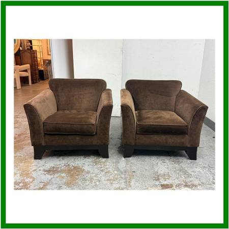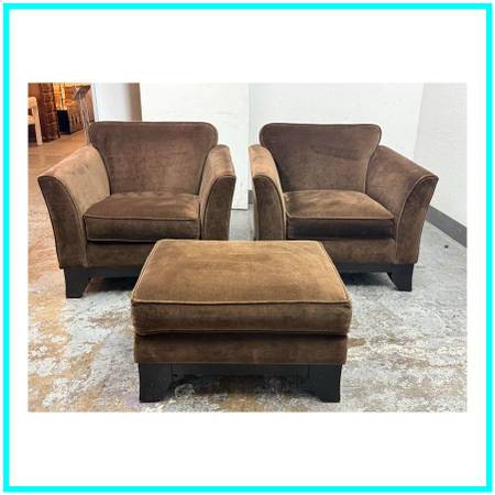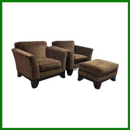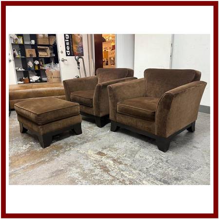 Pottery Barn Dark Brown Velvet Chairs + Ottoman, Set of Three. Original Price: $2,800