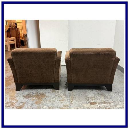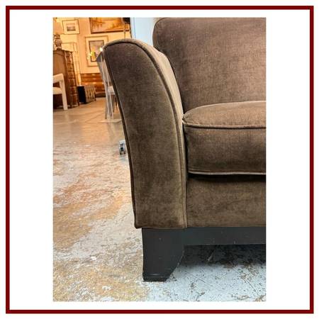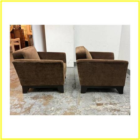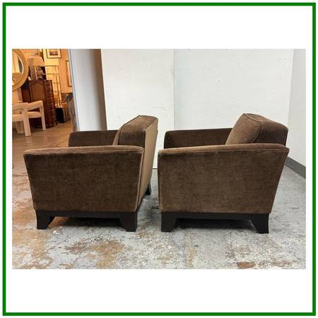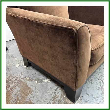 Design Plus Gallery presents a Pair of Brown Velvet Accent Chairs + Matching Ottoman from Pottery Barn. The chairs have a flared arm to invite a wider seat with favorable contemporary style. Their sultry velvet fabric is even richer with the tone of dark chocolate brown, can please a wide variety of homes. Conditions are minimal with surface wear mainly on the ottoman with visible scratches on base and feet.