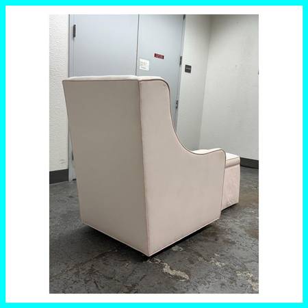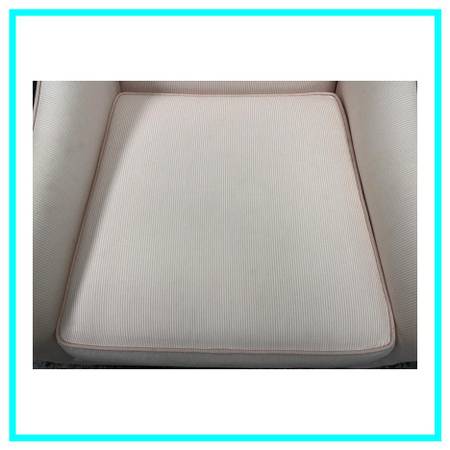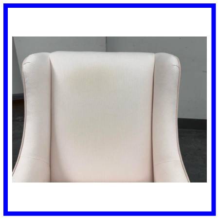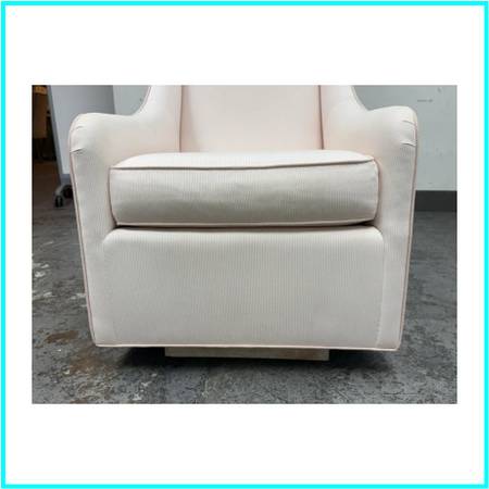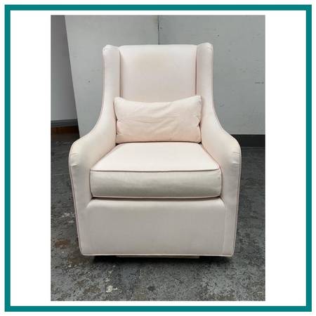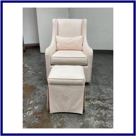 Design Plus Gallery presents the Merced Glider + Ottoman from Pottery Barn Kids. With its clean lines and sides that slope into curved arms, the Merced Glider blends timeless and modern design elements. Extrathick cushioning and a sturdy hardwood frame combine welcoming comfort with strength and longevity. Plus, a skirted ottoman perfectly proportioned to keep you comfortable when nursing. The set was custom upholstered in a pale pink ticking stripe with white and included a lumbar pillow too. The removable seat cushion shows visible wear on both sides so a replacement or heavy duty clean is suggested. Other than that the chair + ottoman are in good condition with some visible wear that is consistent with their usage.