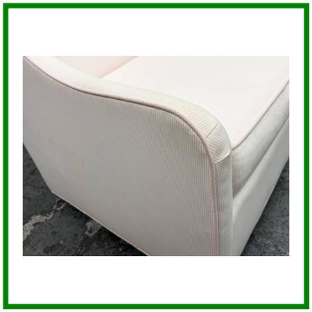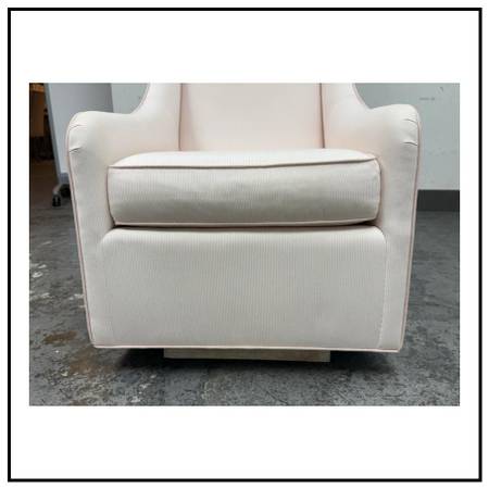Design Plus Gallery presents the Merced Glider + Ottoman from Pottery Barn Kids. With its clean lines and sides that slope into curved arms, the Merced Glider blends timeless and modern design elements. Extrathick cushioning and a sturdy hardwood frame combine welcoming comfort with strength and longevity. Plus, a skirted ottoman perfectly proportioned to keep you comfortable when nursing. The set was custom upholstered in a pale pink ticking stripe with white and included a lumbar pillow too. The removable seat cushion shows visible wear on both sides so a replacement or heavy duty clean is suggested. Other than that the chair + ottoman are in good condition with some visible wear that is consistent with their usage.