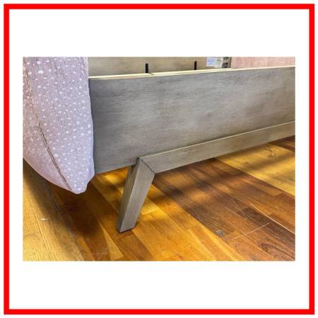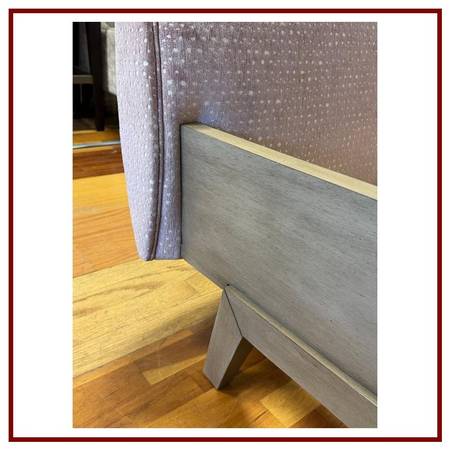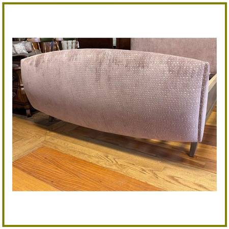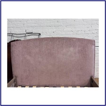 Design Plus Gallery presents the Queen Size Hope Bed Frame by Hickory Chair. One of one design, the queen bed frame has a dusty rose chenille head + foot board with white flecks rod different shapes/sizes running through as its pattern. The soft tone of dusty rose works very well with the weather stone finish side rails that are exposed. Beautiful shape will make the bed an eye catching as well as inviting addition in your guest room. Overall, the bed frame is in good condition for its age with minimal surface wear that is consistent with use. Visible sun fading on the back of the headboard.