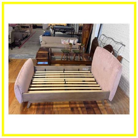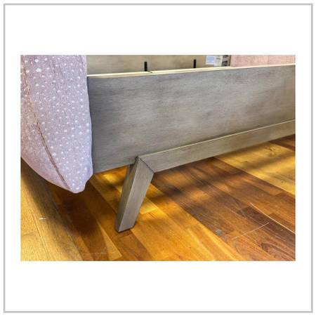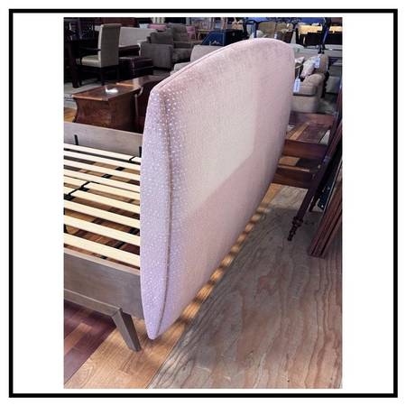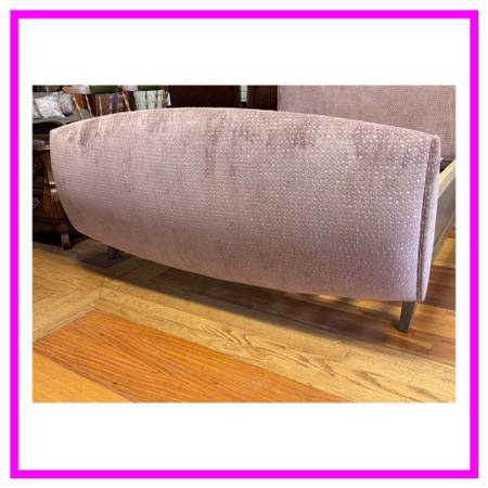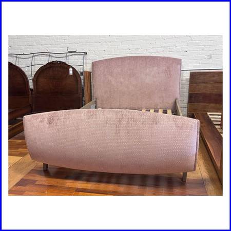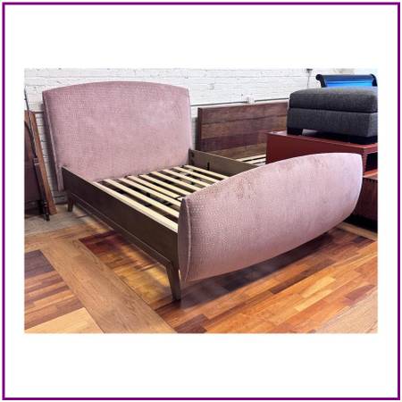 Design Plus Gallery presents the Queen Size Hope Bed Frame by Hickory Chair. One of one design, the queen bed frame has a dusty rose chenille head + foot board with white flecks rod different shapes/sizes running through as its pattern. The soft tone of dusty rose works very well with the weather stone finish side rails that are exposed. Beautiful shape will make the bed an eye catching as well as inviting addition in your guest room. Overall, the bed frame is in good condition for its age with minimal surface wear that is consistent with use. Visible sun fading on the back of the headboard.