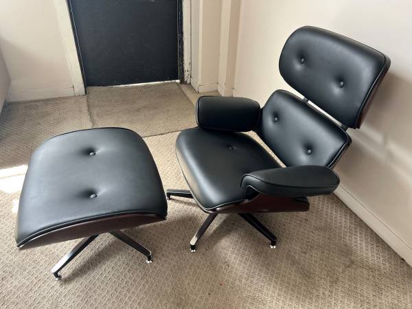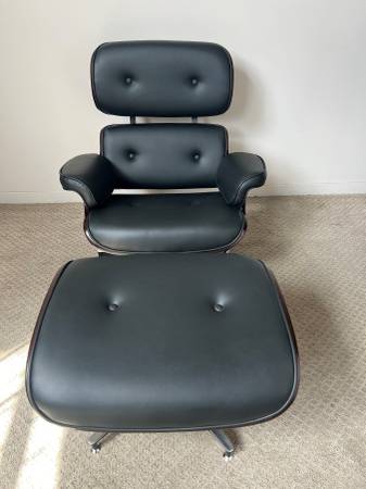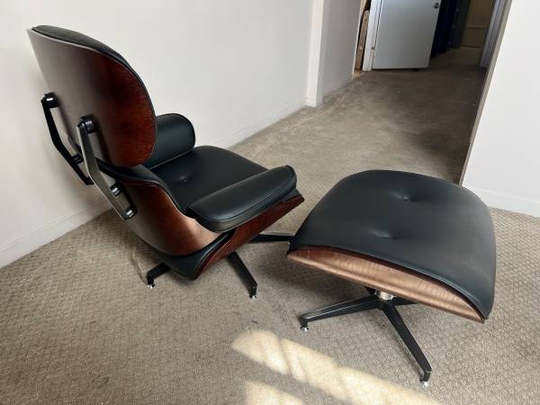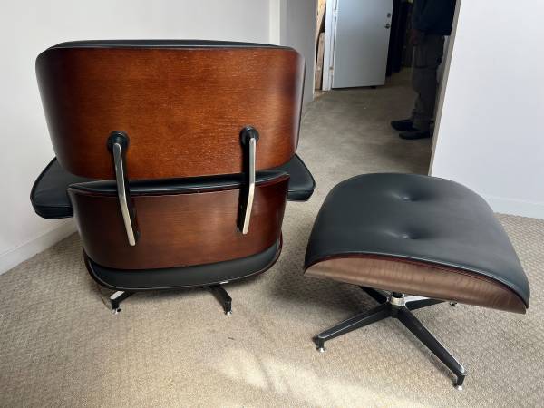 Up for sale is (2) pre-owned Like New Replica Herman Miller Eames Style lounge chairs with polished aluminum base & dark walnut back shell & accent in black faux leather with matching ottoman. We are asking for $850 each plus tax for them condition. Please feel free to set up a showroom appointment to check them out.