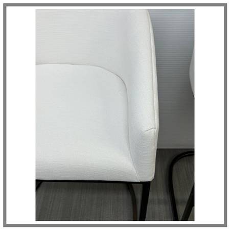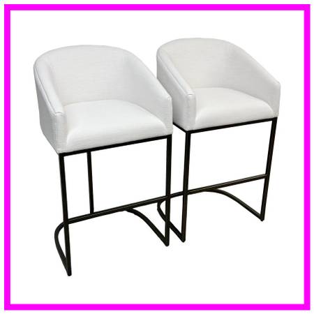 Design Plus Gallery presents a Pair of Emery Bar Stools from Restoration Hardware. The stools have a curvy handcrafted wood frame with a generously padded seat of highresiliency foam, then tailored in white linen upholstery. Their tubular base is made from steel and is powder coated black. Light surface wear; condition is good for age and use.