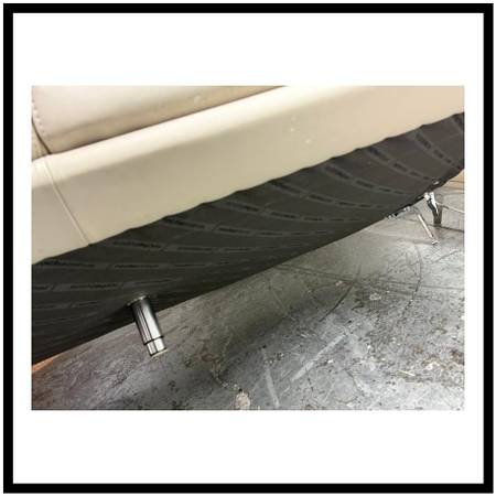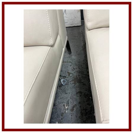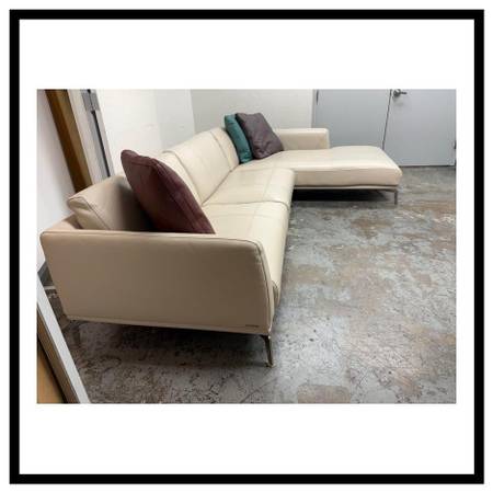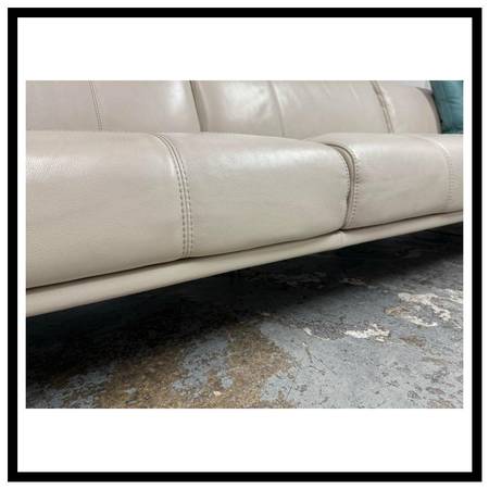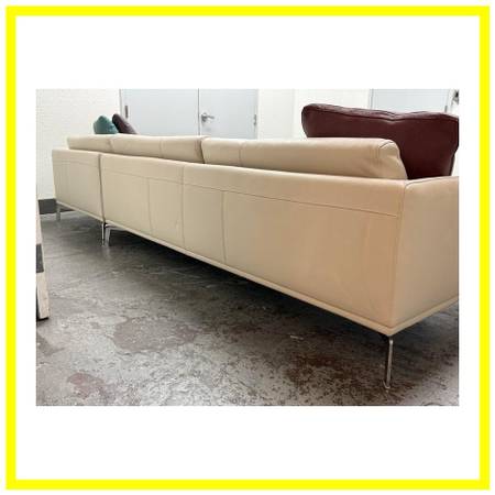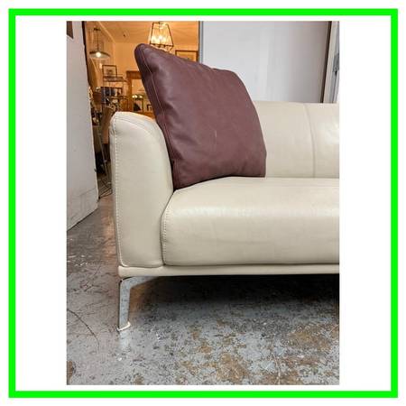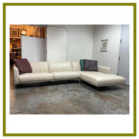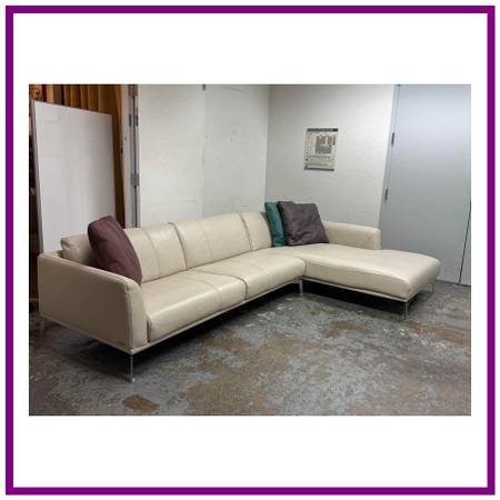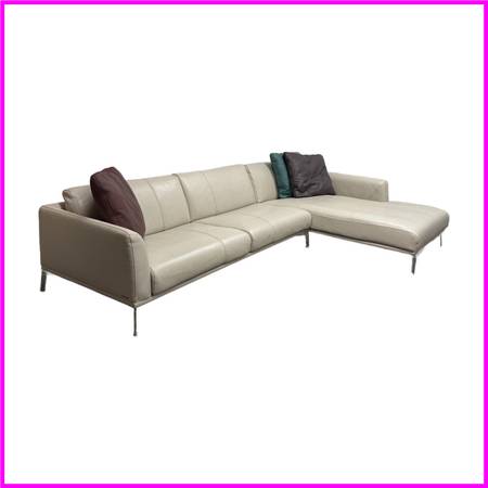 Design Plus Gallery presents a Leather Sectional by Roche Bobois. As leaders in Italian modern furnishings you can rest assure that this sectional will deliver superior style with amazing comfort. It has supple Italian leather upholstery wrapping around its entirety in a taupe tone that leans more ivory. The foundation is strong on the two piece sectional with strong chrome plated metal feet that give the illusion it is floating. There are several throw pillows, also of leather to coordinate in your home of purple and green. Overall the chaise lounge sectional is in good condition with wear that is consistent with usage.