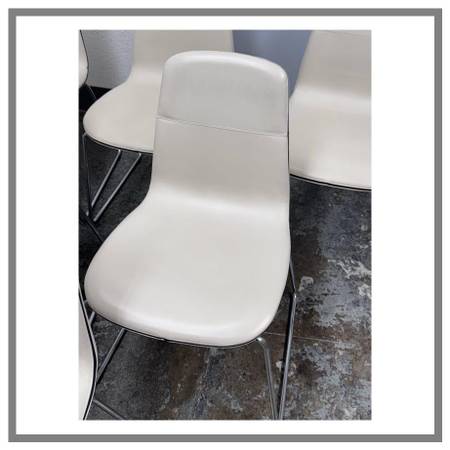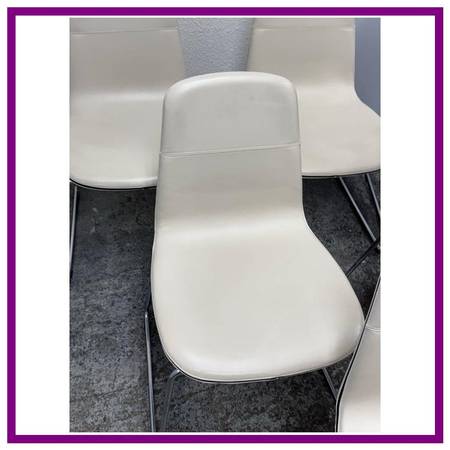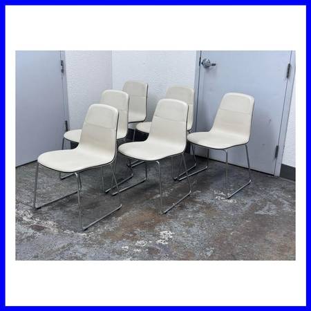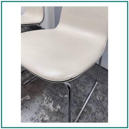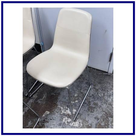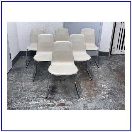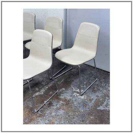 Design Plus Gallery presents a Set of Six 2Leather Seat Dining Side Chairs by Rodolfo Dordoni for Matteograssi. The 2Leather collection is a signature product set within the Matteograssi exclusive product range. Handmade to ensure the highest quality and attention to detail its simple but elegant design denotes beauty and adds refinement to any setting. The 2Leather Seat is upholstered in the highest quality coach hide/ leather in their color Creta and built on a linear designed chromed steel base. Its elegant form and contrasting but subtle trim gives an air of graceful design. There are discreet rubber glides to ensure there is no slippage. The base of each chair holds a sticker from the brand. Overall the set of chair are all in good condition for their usage. Made in Italy.