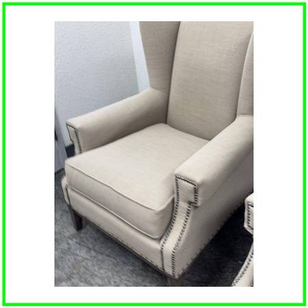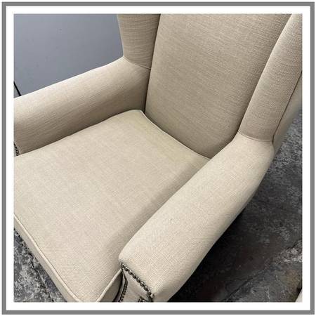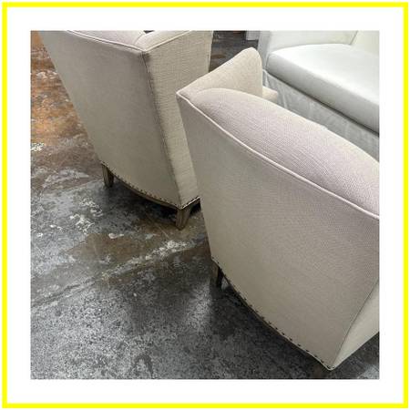 Design Plus Gallery presents a Pair of Arm Chairs from Sam Moore Furniture a division under Hooker Furniture. Turn your home into a classic getaway with the additional of these subtlety toned armchairs of a Taupe upholstery with a cotton weave. They have generous seat width and depth with ultra high seat backs with wide arms for you to sink right into. Nailhead trim is offered at all seam joints to prevent fraying and wear to occur. This style is no longer in production with the brand and overall they are in good condition with visible fading from sun exposure. Made in USA.