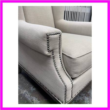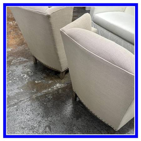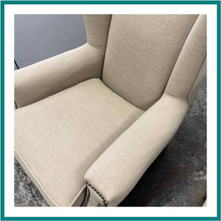 Design Plus Gallery presents a Pair of Arm Chairs from Sam Moore Furniture a division under Hooker Furniture. Turn your home into a classic getaway with the additional of these subtlety toned armchairs of a Taupe upholstery with a cotton weave. They have generous seat width and depth with ultra high seat backs with wide arms for you to sink right into. Nailhead trim is offered at all seam joints to prevent fraying and wear to occur. This style is no longer in production with the brand and overall they are in good condition with visible fading from sun exposure. Made in USA.