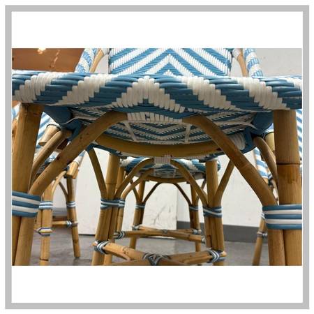 Design Plus Gallery presents a Set of Four Chevron Riviera Side Chairs from Serena Lily. The set is inspired by classic 1930s European bistro piece and reinterpret to elevate them to new heights. They are handcrafted with sustainable rattan and woven plastic seats, great for the kitchen or the patio. they are all in good condition for their usage.