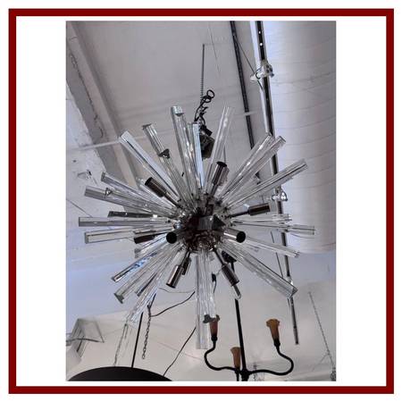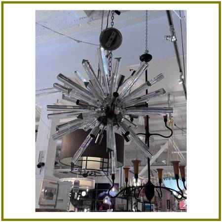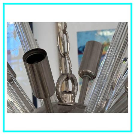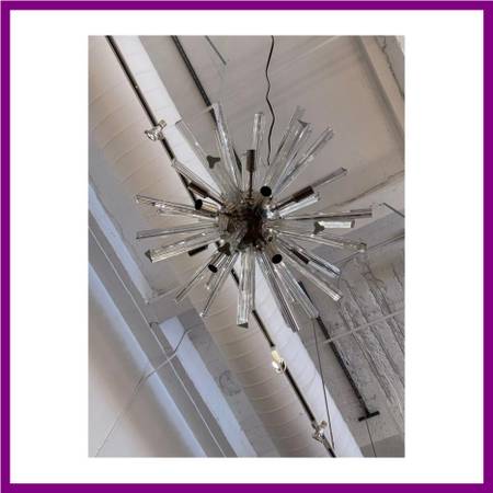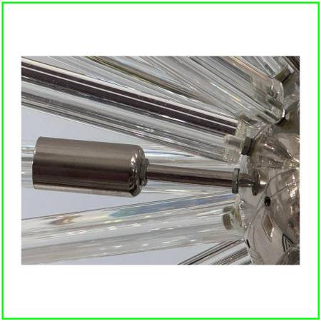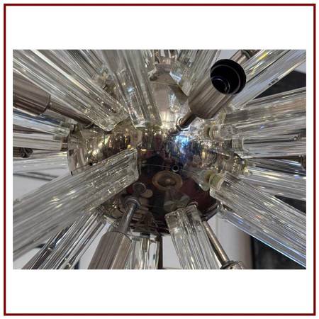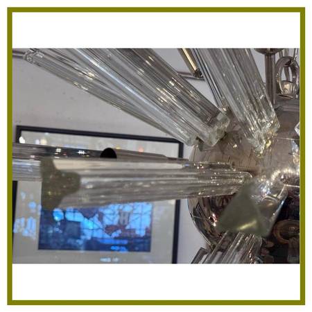 Design Plus Gallery presents a Sputnik Chandelier. A modern take on the midcentury icon, this Sputnik chandelier radiates with triedre crystal rods that catch and refract light in brilliant. Each threesided rod extends from a sleek, polished nickel body, creating a dynamic starburst silhouette that feels both sculptural and airy. The gleaming nickel stem and lowprofile canopy provide a refined counterpoint to the crystals crisp geometry, grounding the piece with a cool, luxurious finish. Whether centered over a dining table, punctuating a living room, or making an entrance in a foyer, the chandelier delivers drama without heaviness. Designed to impress from every angle, its a statement fixture that blends vintage inspiration with contemporary clarity and polish. Missing Eight Triedre Rods, chandelier is not complete. In good condition. Rods are removable.