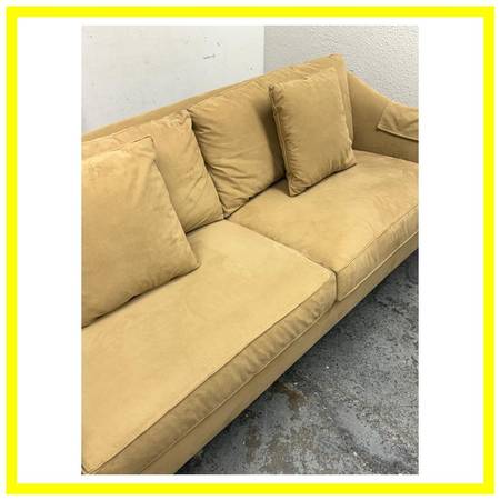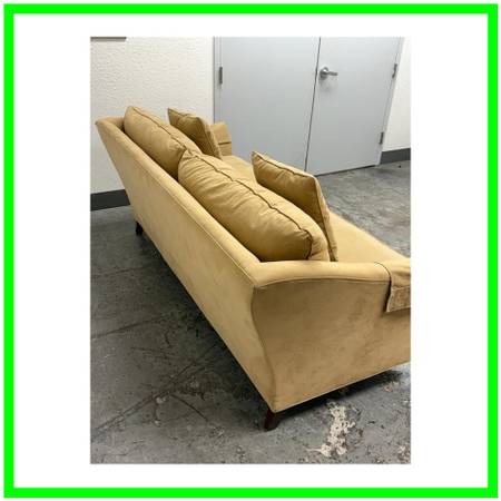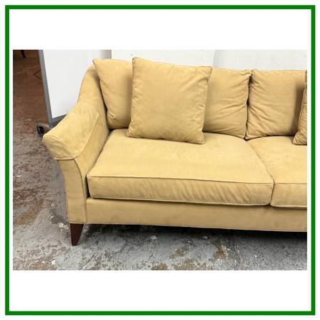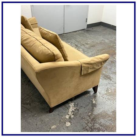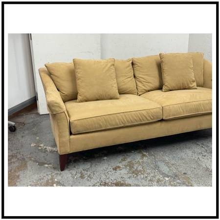 Design Plus Gallery presents the Broadway Sofa from Stickley Furniture. The Broadway has gently flared side arms and is wrapped in a stain resisting golden tan upholstery around its mahogany frame. There are two loose seat + back cushions with two matching throw cushions in same material. The sofa will maintain its comfort for many more decades to come with its craftsman made poise and luxurious materials. This Broadway sofa is no longer in production by the brand. Overall, it is considered to be in good condition for its age with visible, minor wear on fabric and legs with cleaning recommended. Made in the USA.