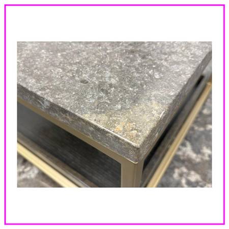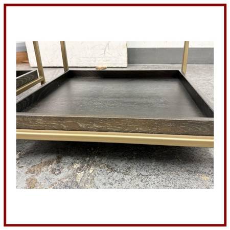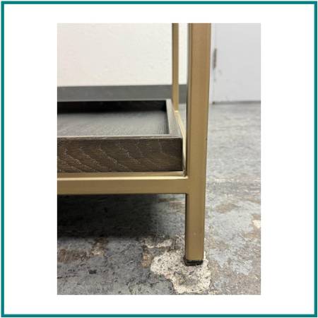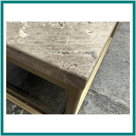 Design Plus Gallery presents a Pair of Arden Side Tables from Sunpan. These Arden Side Tables combine rustic charm with minimalist elegance, creating a timeless piece for any living space. They offer a stunning grey marble top and a solid oak wood tray shelf in umber brown. They are completed with sleek brushed gold iron frames that contrast with the natural materials. Both are in good overall condition for their usage. Made in Canada.