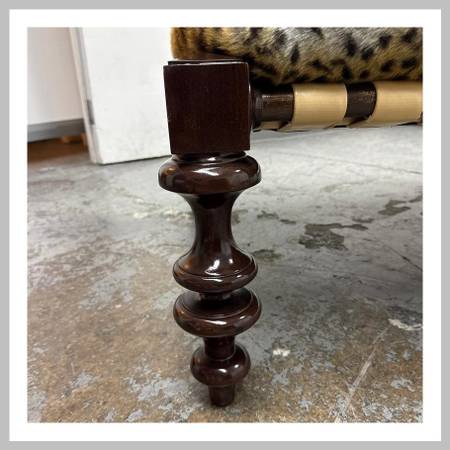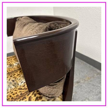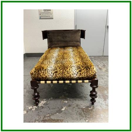 Design Plus Gallery presents a Custom Kyrelos Chaise Lounge by Therien Studio Workshops. Crafted from solid Mahogany woods. A klismos frame back and front turned wood legs. A platform is held up with cream finish leather straps. The removable seat cushion is upholstered in a fuzzy leopard print. A custom removable back cushion. Cushions can easily be reupholstered. In good condition, visible and minimal wear from usage. Small chip on the wood leg. This is a discontinued model. Made in USA.