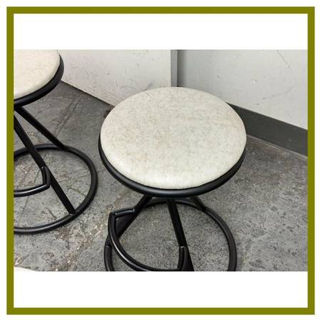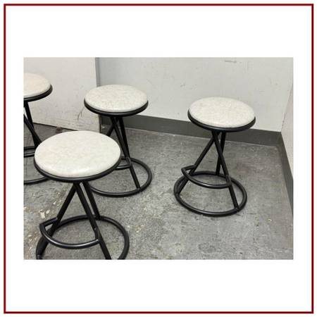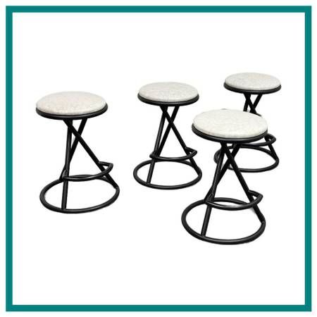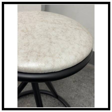 Design Plus Gallery presents a Set of Four Joker Counter Stools from Timothy Oulton. Clowns to left of me, jokers to the right goes the 1972 song, inspired by a true occasion when songwriters Gerry Rafferty and Joe Egan were stuck in the middle of record producers at a restaurant. The Joker is perfect for casual entertaining over late night drinks and old records, with softly worn vintage leather for a comfortable seat into the early hours. The seats are upholstered in a Vintage Bianco leather (cracked white) with Matte Black base finish. In good condition, visible and minimal wear from usage.