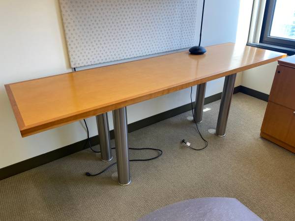 (1) Used 84"L x 24"D x 29"H rectangular maple wood table (1 piece top) with dark maple wood edge band & (4) aluminum cylinder legs $850