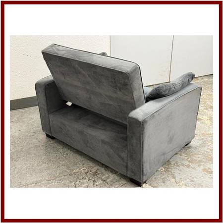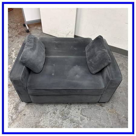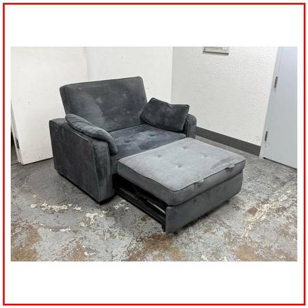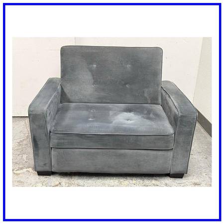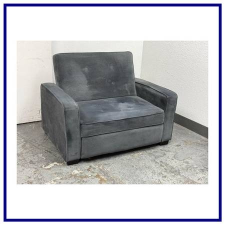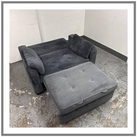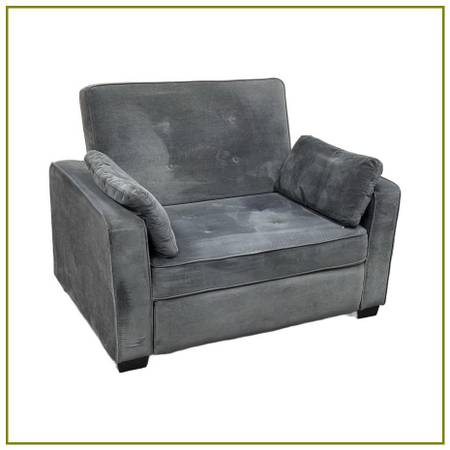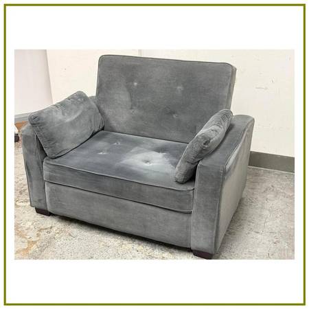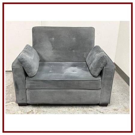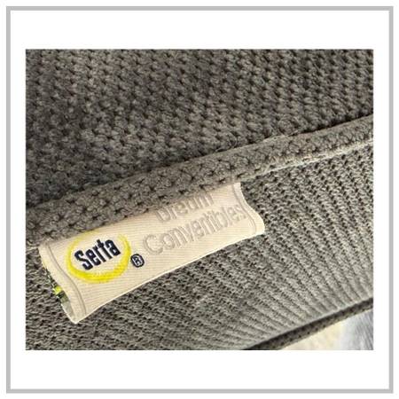 Design Plus Gallery presents a Twin Convertible Chair by Serta. The multifunctional chair works beautifully as a lounger, and extra bed when needed. Throw pillows for lumbar or additional arm comfort. The durability of this chairs solid hardwood frame and legs as well as its highquality woven fabric upholstery will stand up to years of everyday use. Detailed with self welting and shallow tufted buttons. Visible surface wear; condition is consistent with age and use.