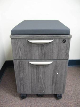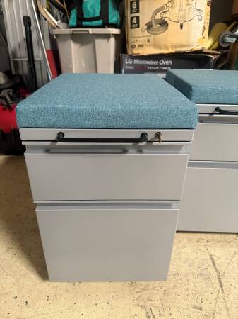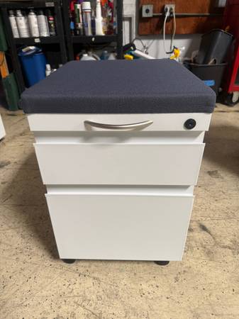 (6) Used Unknown 15.5W x 19.25D x 22.5H box file mobile pedestal in white metal with charcoal fabric cushion & nickel finish curved handle, lock & key $95 each