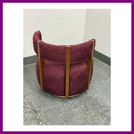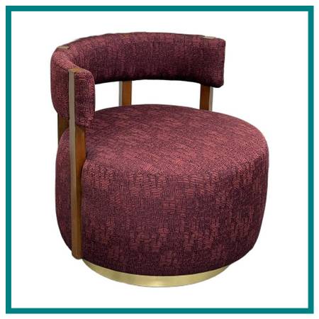 Design Plus Gallery presents a Club Swivel Chair in a Rich Gem Tone from Village West Design. The chair has a cool retro feel with a nod to mid20th century styling. There is a rounded lumbar back connecting the upper to lower with exposed walnut wood beams. The entirety of the chair, minus the beam and brass platform base, is in a jewel tone of burgundy, similar to Raspberry. There is a pattern of interlocking grid lines making it not only striking but interesting too. It is in good condition with minimal visible wear for its usage.