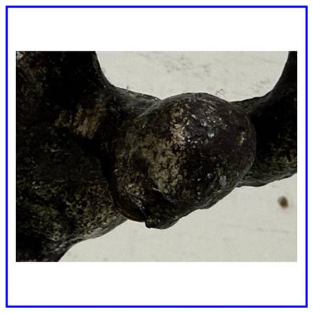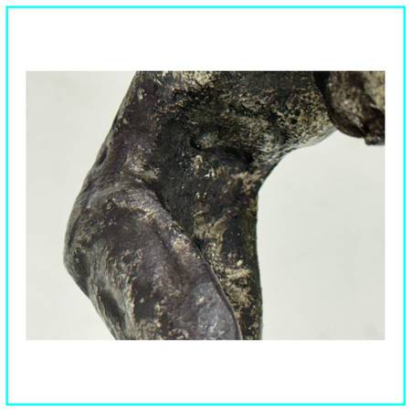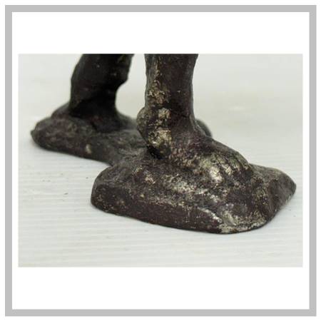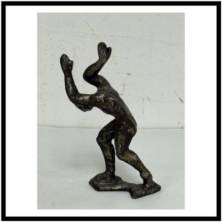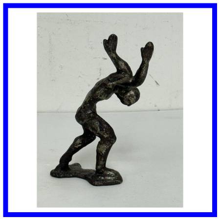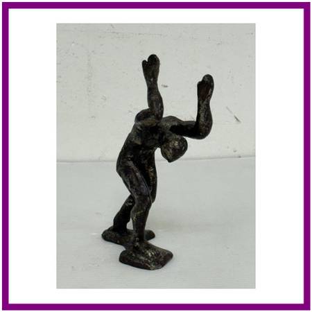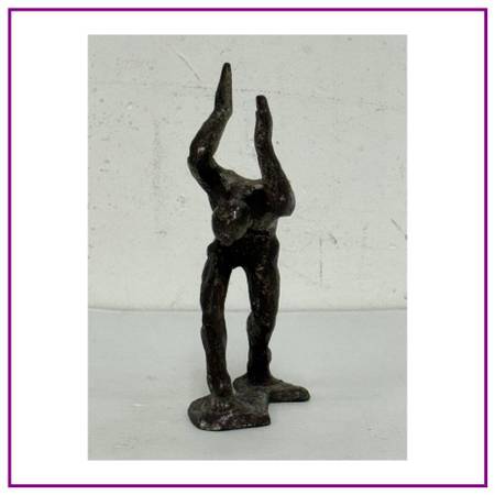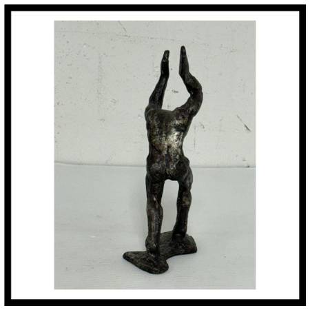Design Plus Gallery presents Vintage Cast Bronze Figure Sculpture. The figure is a male who has his arms and hands up in the air while his head is tilted down. In the reference of the figure carrying heavy weight over his shoulders. In good condition, visible and minimal wear.